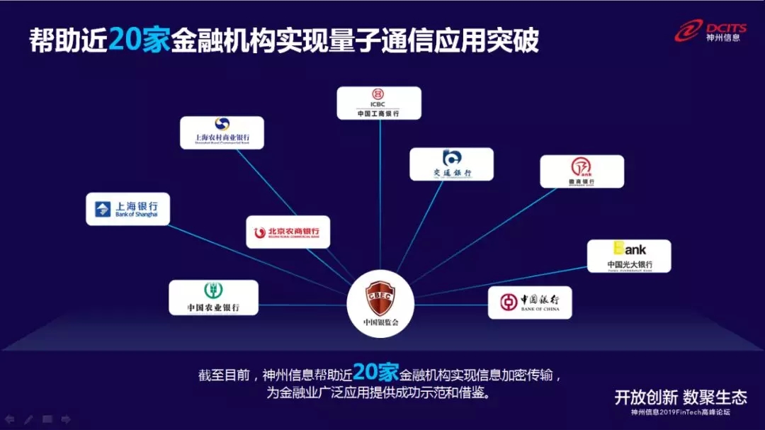 神州信息早在2012年进入量子通信领域,参与国家量子骨干网建设,又携手国盾量子等成立合资公司神州国信,加速产品研发及行业应用落地,至今已经在网络建设、行业应用等方面取得较大突破。目前,神州信息帮助近20家金融机构实现信息加密传输,在部分业务系统中应用量子通信强化安全防护,其中包括银监会及中、农、工、建、交5大行,为未来金融业广泛应用量子通信提供成功示范和借鉴。
