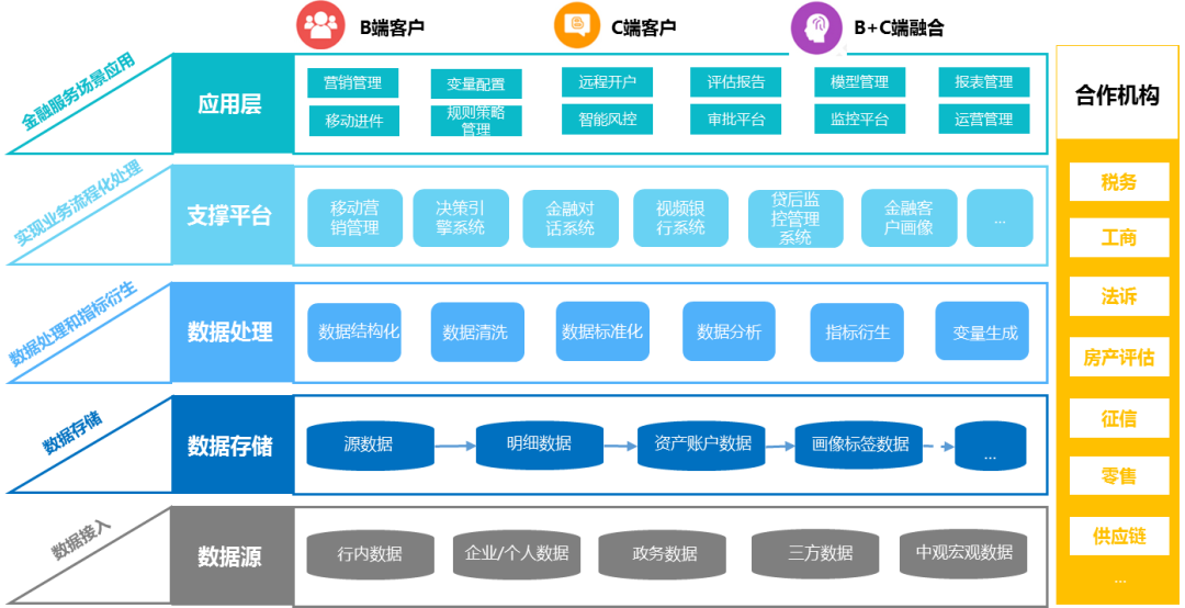 一站式信贷SaaS服务平台的定位和服务可从技术架构图中看出——包括从底层的数据接入、数据存储、数据处理和指标衍生,到上层的实现业务流程化处理以及金融服务场景应用。底层数据接入后,将数据形成资产标签进行存储,再进行数据处理和指标衍生以支持B端客户、C端客户以及B+C端客户整体的信贷风险决策。神州信息整体的风控解决方案框架以税务数据为核心,帮助企业构建信用资产账户,实现对自身信用资产的持续管理、优化和增值应用。