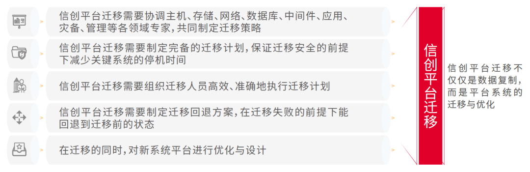 神州信息信创平台迁移服务,通过一体化系统迁移解决方案,帮助用户进行信创平台软硬件迁移。协调主机、操作系统、存储、网络、数据库、中间件、应用等各领域专家,共同制定迁移策略,制定完备的迁移计划,在保证迁移安全的前提下减少关键系统的停机时间。组织迁移人员高效、准确地执行迁移计划,在迁移的同时,对新系统平台进行优化与设计。