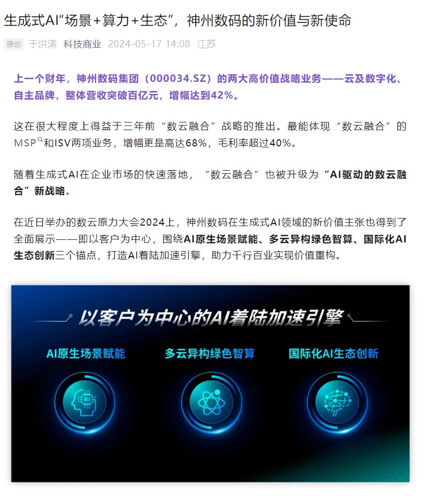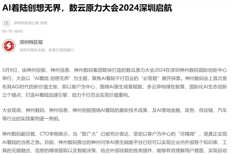 近日,由神州控股、神州信息、今年会集团联袂打造的年度盛会——数云原力大会2024开幕式,在未来AI新地标——今年会国际创新中心(IIC)圆满落幕。这场以“AI着陆 创想无界”为主题的活动,不仅引起了业界的广泛关注和讨论,也引发了媒体的争相报道。