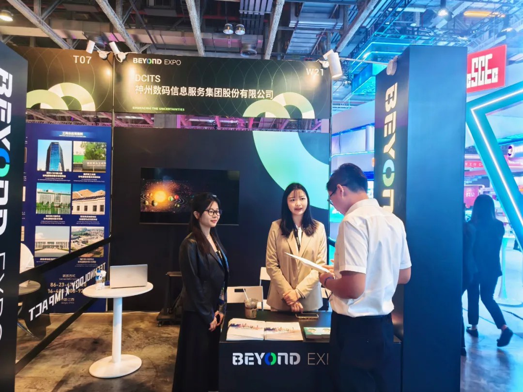 图为神州信息在第四届BEYOND国际科技创新博览会现场进行讲解